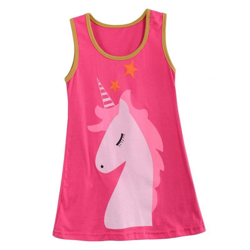 Летний сарафан из тонкого легкого трикотажного полотна "кулир". Сарафан украшен накатом "единорог" Рост 98-104 см. (малиновый): длина 53 см., ПОГ 27 см. Рост 110-116 см. (малиновый): длина 57 см., ПОГ 31 см. Рост 122128 см. (нежно розовый): длина 59 см., ПОГ 32 см.