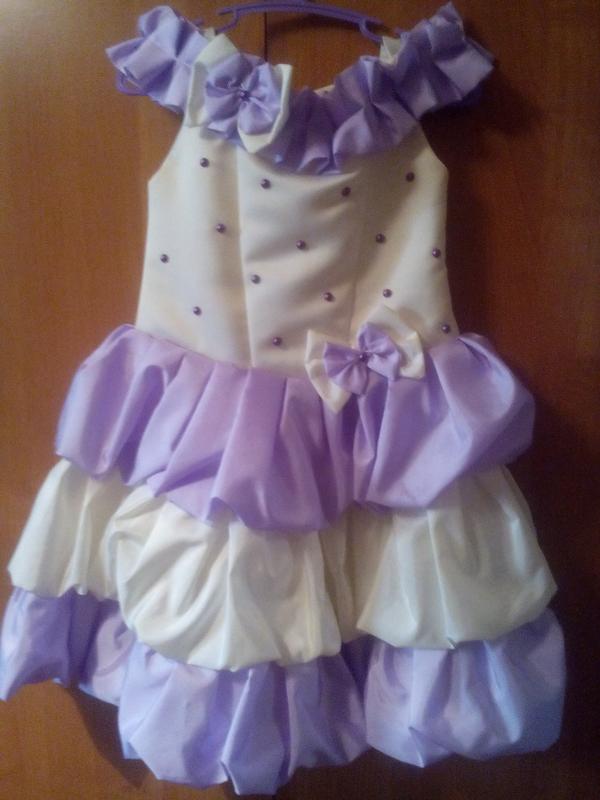 Красивое платье желто-сиреневого цвета перчатки и цветочки в причёску. В состоянии нового, без дефектов, без пятен, без затяжек и т.д. НА 3-6 лет. ОДЕТО 1 раз!! Длина от плечика (спинка) - 64 см длина по центру (от края выреза по спинке) - 61 см ширина под ручками - 33 см (полуобъем) ширина корсета - 33 см (полуобъем) Ширина корсета регулируется шнуровкой по спинке.