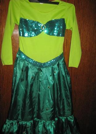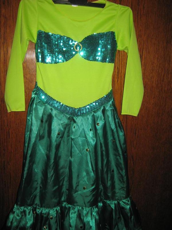Одевали платье на утренник ( были русалкой ) Замеры длина с фатином 88 рукав 40 см ширина 30 см . верх платья чуть тянется. Без дефектов и пятен. Пересылаю.