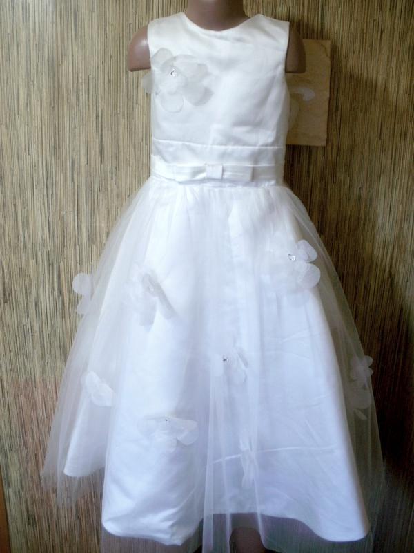 8-9 лет , длина 100, до талии 32 , пог 32 см , идеальное состояние , ткан атлас с верхним слоем фатина расшитыми цветами , шелковая подкладка по юбке с фатиновой оборкой , застежка по спинке молния