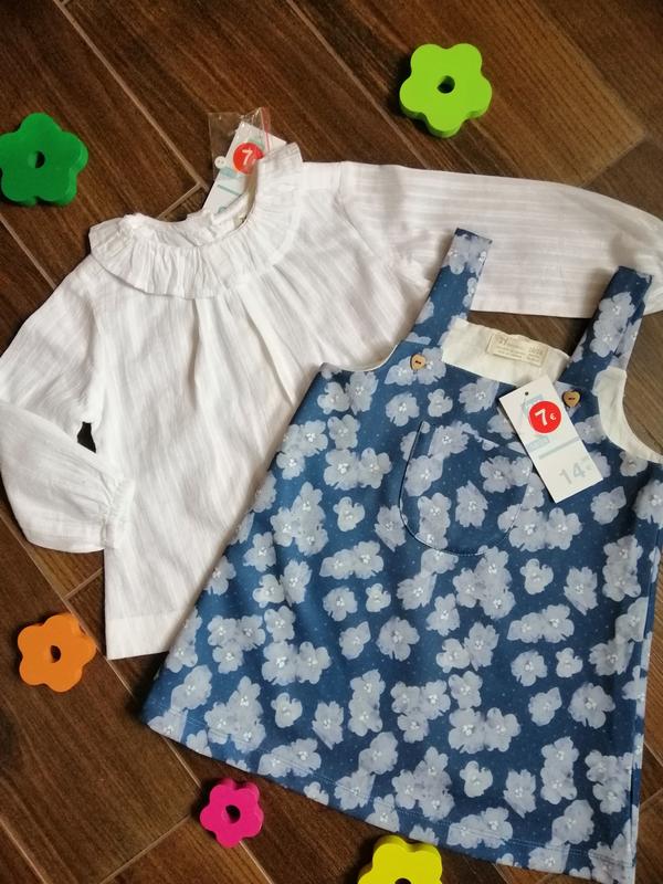 Красивый новый комплект для стильной малышки 18-24мес. Белая рубашка с воротником в мелкую дырочку прекрасно сочетается с синим сарафаном в цветы 👍 Цена комплекта 300грн