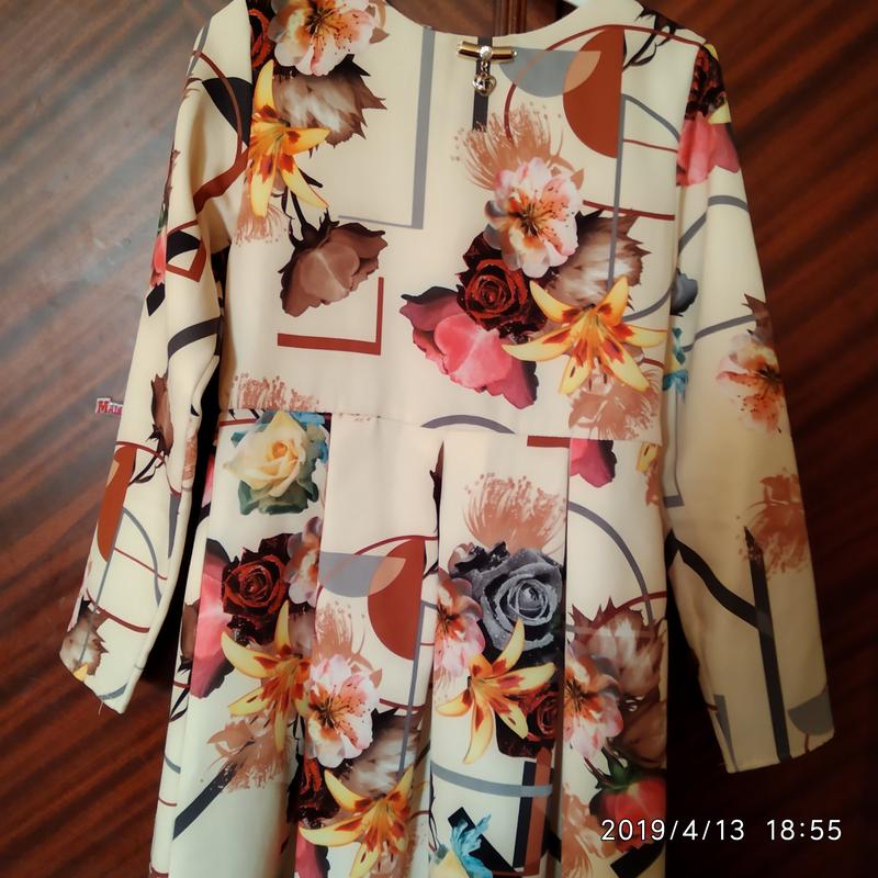 Красивое трикотажное платье бледно-желтого цвета в цветах. Рукав длинный, круглый вырез, от пояса идут складочки. На спинке застежка-молния. Дл. по спинке 69см., ПОТ 31см., Рукав от плеча 49 см., по вн. шву 38см. Какие мерки еще нужны, пишите.