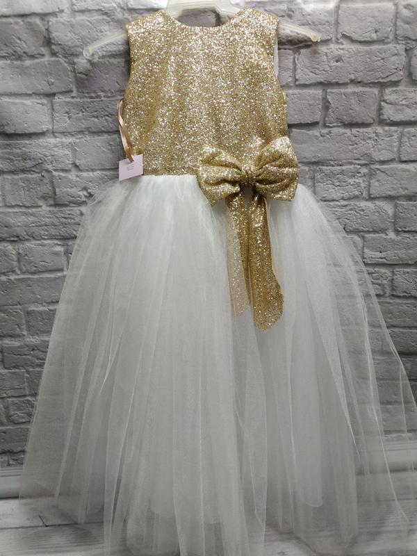 Великолепное красивое, пышное платье для девочки на любой праздник. Цвет светлое золото с белой пышной юбкой.. Отделка лифа платья выполнена из качественной евросетки с золотом глиттером, что придает платью неповторимую красоту, шарм и изысканность. Юбка очень пышная из шести слоев фатина., что исключает необходимость в дополнительном использовании подъюбника. На спинке красивая и очень удобная фиксация платья шнуровкой. В этом наряде ваша девочка будет самая неотразимая на любом празднике. Фото не передает всего блеска и красоты. Вживую платье намного красивее. В наличии все размеры. от 86 до 128 Стоимость зависит от варианта длины и размера 500-850 грн Оплата на карту. Пересылаю Новой Почтой и Укрпочтой. Смотрите другие мои объявления.