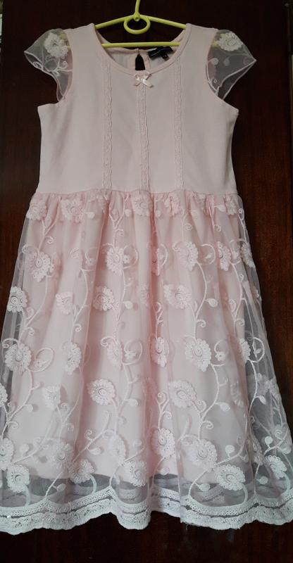 Шикарне плаття відмінної якості На ріст 116-122 Колір ніжно рожевий Верх сукні бавовна, спідниця фатин вишитий Заміри: довжина 59 ширина 31 (пахви)