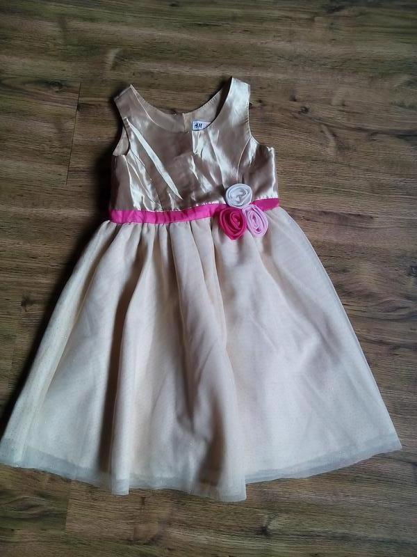 Детское платьице. Нежжное золото с малиновым поясочком. Низ фатин в горошек. Декорировано цветочками. Указанный размер 7-8лет, рост 130. Длина общая 70см,юбка 44см,ПОгруди 32см. Низ из 4юбочек.