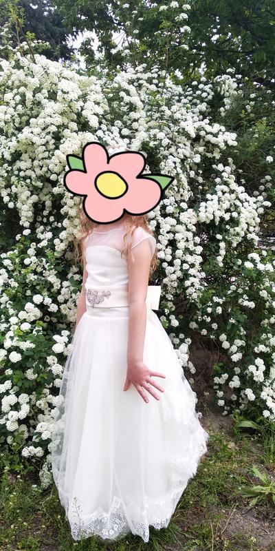 Придбана в дорогому весільному салоні за 1500 грн. надзвичайно гарна сукня молочного кольору. Бантик кріпиться позаду і утворюється гарний шлейф з мережева. Пишна і без кругів."Вагомих" дефектів немає.Підійде на зріст 116-132 см.Може бути варіант і максі,і міді. Фотоапарат не показує справжнього кольору....