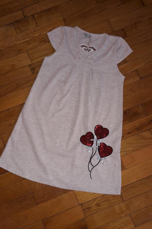Красивое котоновое платье. Спереди пришит бантик. Внизу сердечки-пайетки. Размер 110-116. Длина - 62, ширина - 32.5