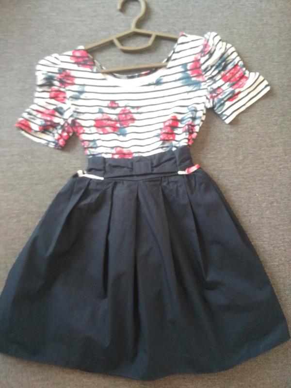 отличное состояние, указан возраст 11лет, ( моя дочка высокая и ей в 10 оно короткое), длинна юбки 37см., верх трикотаж.