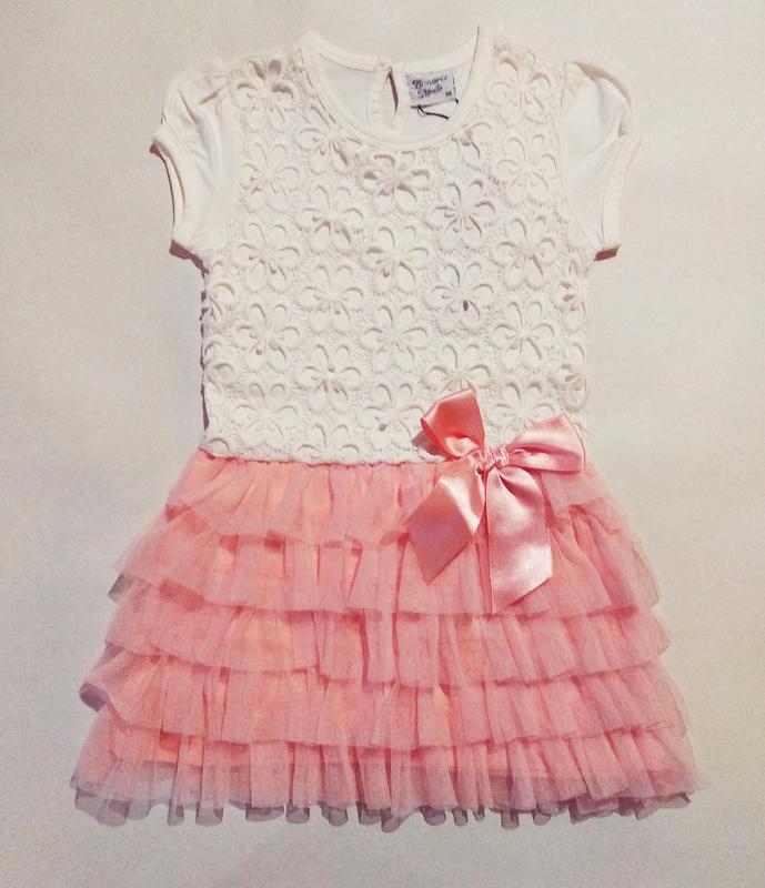 Платье нарядное для девочки с коротким рукавом. Декорировано воздушным, пышным фатином, нежным кружевом. Под фатином - трикотажный подъюбник. Состав: 95% хлопок, 5% эластан. Длинна изделия: 54см. Полуобхват груди: 26см.