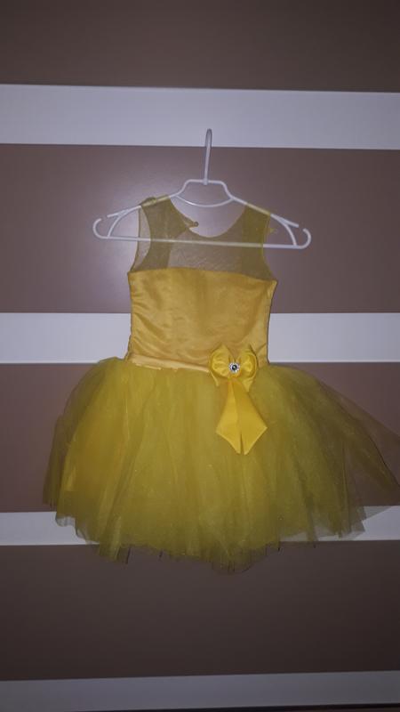 Платье шилось на выступление.Дочка играла роль конфетки.К платью прилагаются желтый длинный плащ(надо погладить) и обруч с конфетой.Платье требует мелкого ремонта.