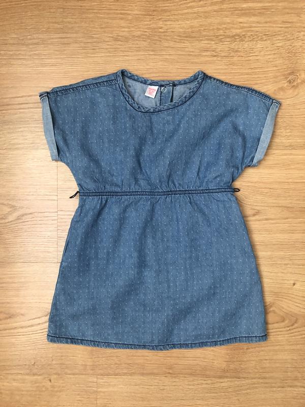 Лёгкое летнее платье на девочку 1,5-2 года. Рассчитано на рост 92 см. Джинс лёгенький. Ткань не парит. Очень хорошее платье для маленькой модницы. Сзади на кнопочках, на талии свободная резиночка. Одевали несколько раз. Без пятен и дефектов