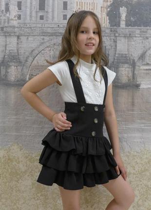 Шкільний сарафан для дівчинки "рюшь-лямка" чорний, синій. Шикарний шкільний сарафан для стильних дівчаток. Розміри 30,32,34,36,38 на вік 5 - 12 років 2 кольори: синій, чорний Виготовлений із сертифікованої костюмної тканини Мадонна. Спереду декорована гудзиками. Збоку застібається на блискавці. Ззаду є гумка. Дуже красиво виглядає на фігурі. Практичний стильний і комфортний! розмір 30 - ріст 116-122 розмір 32 - ріст 122-128 розмір 34 - ріст 128-134 розмір 36 - зростання 134-138 розмір 38 - зростання 138-140 30р .- ширина сарафана по грудях 25 см (в не розтягнутому вигляді, довжина спідниці 37 см, ширина в стегнах (біля рюші) 31 см