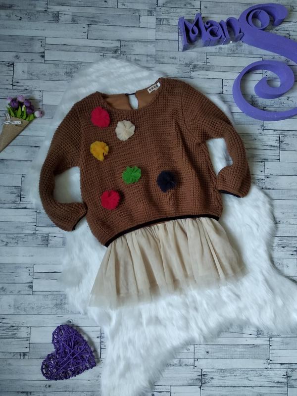 Платье на девочку с фатином верх свитер в очень хорошем состоянии Размер 4-5 лет,рост 104-110 см Замеры: длина 58 см рукав 38 см плечи 31 см ПОГ 40 см ПОТ 40 см цвет коричневый