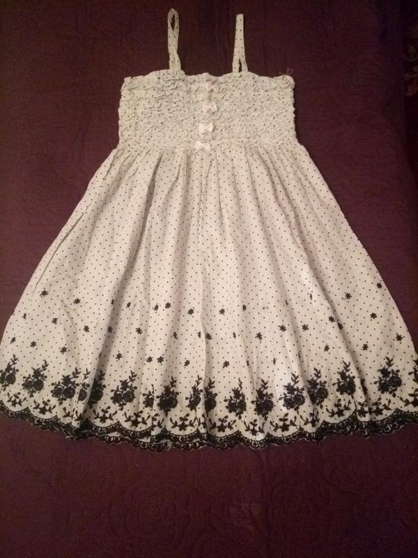 Сарафан на девочку.Натуральный хлопок.Ткань в мелкий и очень мелкий горошек.Спареди верх в несколько рядов воланчики.Подол сарафана вышит и выбит чёрными нитками.Край в виде кружева.Брительки регулируются.Юбка Розклешённая. Бок у сарафана застёгивается на молнии. ПОТ-36см. ПОГ-34см. Длина с брительками 81см.