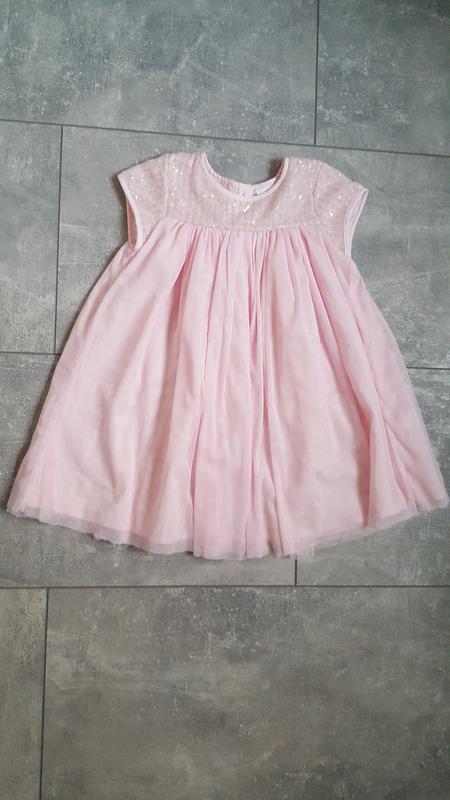 Нарядное платьице нежно розового цвета. Сзади на пуговицах. Верх украшен пайетками. Низ фатин. Три слоя. Замеры: Длина изделия 48см Плечи 20см. Длина рукава 7см ПОГ 30см. Свободного кроя.