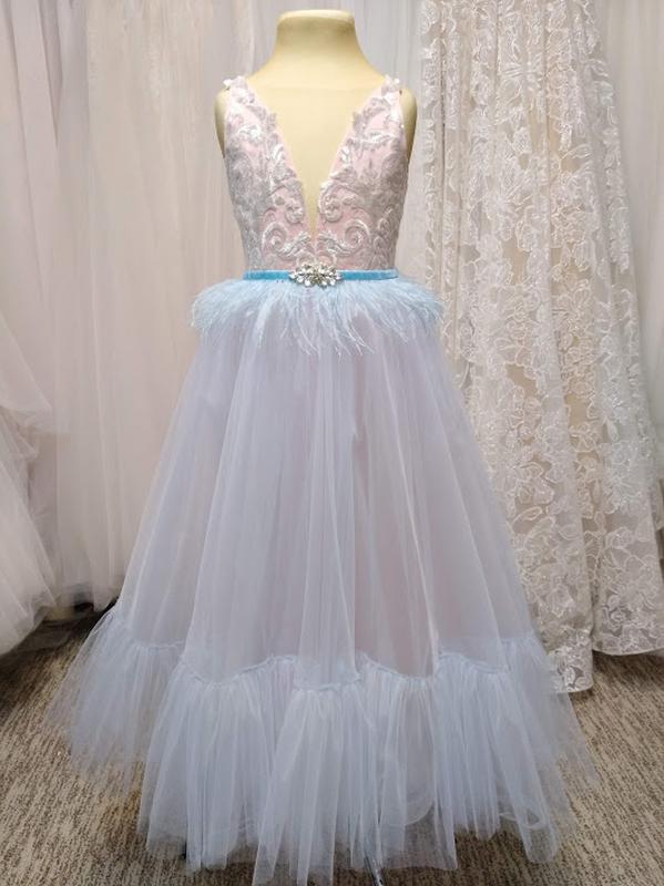 Платье на девочку 5-10 лет. Пышная многослойная юбка. Лиф декорирован блестящей патеткой, по центру прозрачная сеточка. Цвет очень красивый - зефирный, не передать словами, персиковородовый, голубой. Фото к сожалению не передает Длина юбки 67 см, Длина кофточки 27 см, талии до 63 см, объем груди до 66 см.