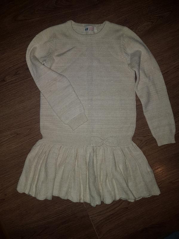 Платьице H&M на девочку р.98-104(большемерит) бежевого цвета с люрексовой ниточкой,тепленькое. Новое,но без бирки. Замерчики: длина 66см длина рукава от плеч.шва 45см ПОГ 35см