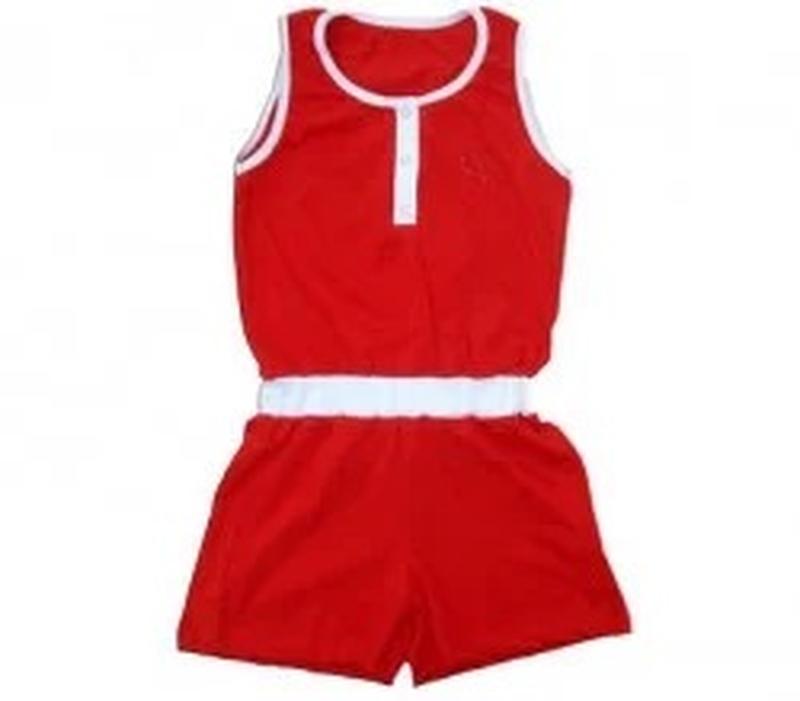 Легкий летний комбинезон (ромпер) для девочки, пояс на резинке, впереди планка на кнопках. Не заменимая вещь в летнем гардеробе юной модницы! Цвет: Красный; Полотно: Кулир; Состав: 100% хлопок; В наличии рост 128, 134, 140