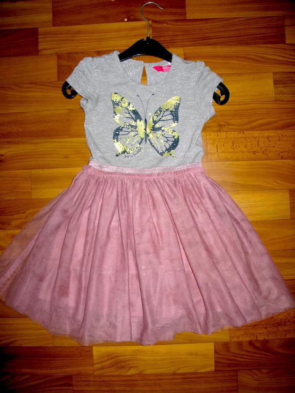 платье Y. D. на 4-5 лет (110). Верх-52% вискоза (ткань как у футболок, с люрексом), Низ- 3 слоя фатина и подъюбник (35% хлопок, 65% полиестр). На груди золотистая бабочка. Дл от пл- 64 см, от пл до пояса-26 см, ПОГ-29 см, ПОТ-26-33 см (в поясе блестящая резинка). Состояние хорошее, есть несколько затяжек