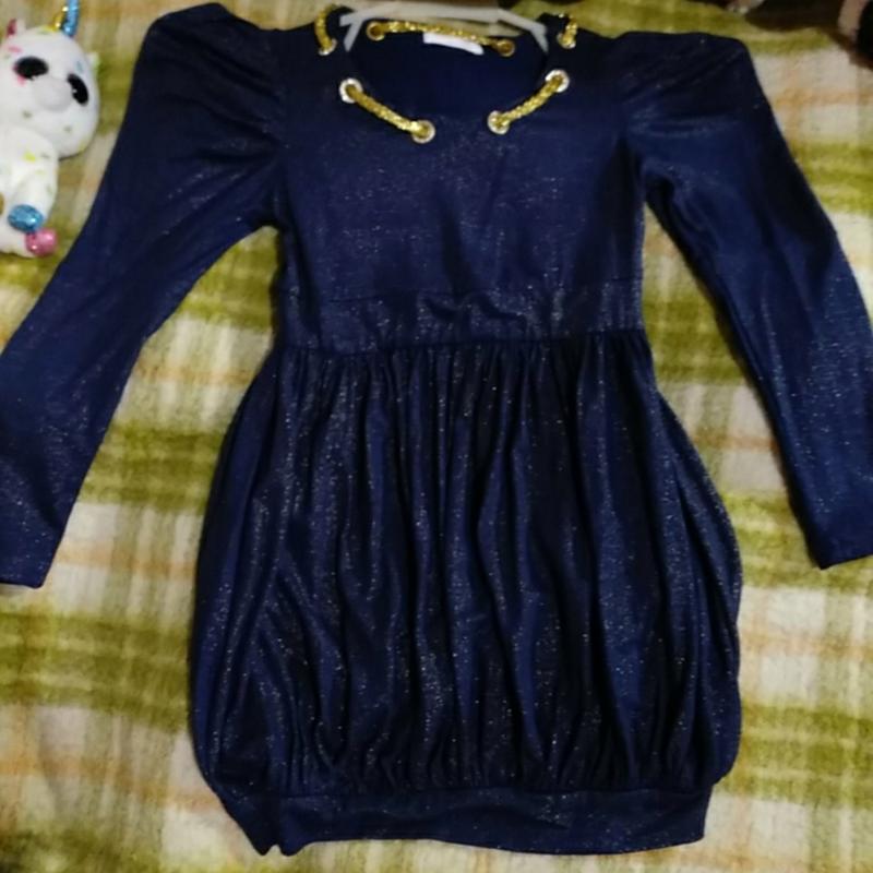 Трикотажное платье с люрексовым напылением. Юбка - балон, оригинальная форма рукавов, по типу - фонариком. Покупалось на сайте LeBootiq, одевалось пару раз на праздники и на фотосессию. Длина до пояса - 24, общая длина - 61, рукав- 45,5, ПОГ -32, ПОТ -28. Ткань хорошо тянется, приятная к телу.