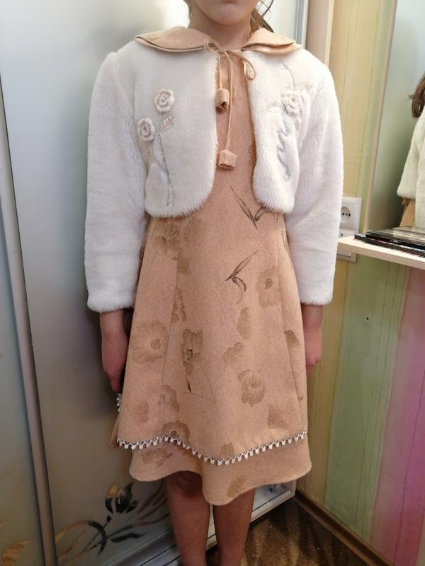 Платье детское бежевого цвета с меховым жакетиком. На рост 130-140 см. Носили на торжественные случаи в возрасте 7-9 лет. В отличном состоянии, без дефектов. Сзади на молнии. ПОг 37 см, длина 83 см. Длина жакета 33 см, длина рукава 44 см