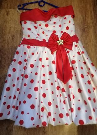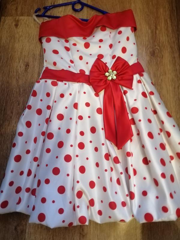 Платье новое, белое в красный горох, корсет на молнии и стягивается на шнуровке ,размер регулируется за счёт карсета, пышное и на подьюбнике, не подошёл размер.Покупалось дороже.