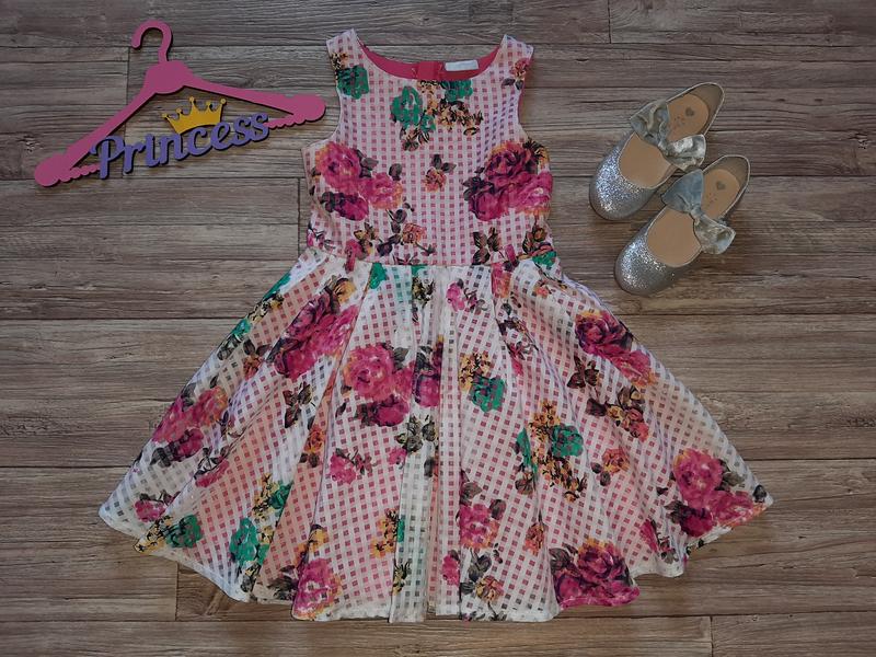 Красивое нарядное платье в цветочный принт с пышным подьюбником на девочку 7-8лет. Подкладка хлопок, верх полиэстер, подьюбник в три слоя еврофатин хлопок) Длина 67 (верх 29, низ платья 38) ПОГ 32 ПОТ 30 Новое, без бирки