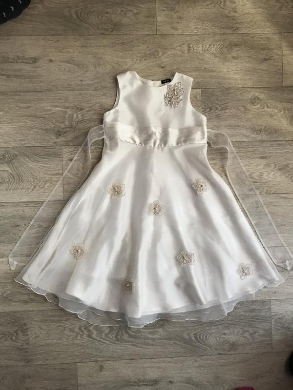 Платье в хорошем состоянии, без дыр и пятен. Размер указан на 110 см, но моя дочка одевала и при 116 см, просто, длина была меньше. Сверху органза или шифон, не могу сказать точно... далее атлас. По платью красивые аппликации цветов, обшитые пайетками. Цвет ближе к Айвори. Замеры по запросу На фото у ребёнка рост 115 см. Пересылаю Новой или Укрпочтой.