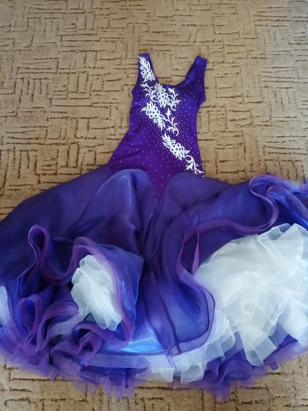 Красивое фиолетовое платье стандарт. Для девочек 12-13 лет. Платье состоит из нескольких фиолетовых и белых юбок, камни на платье Сваровски. Имеются украшения на руки.