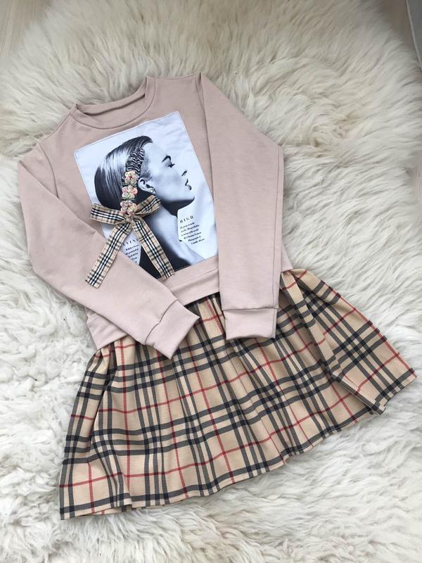 Стильное платье, ткань двунитка с сочетанием с трикотажной клеткой аппликация пришита 122 128 140 Замеры осуществлялись вручную, с одной ростовки, возможна разбежность в 1см. 122 - Длина 58, пог 35, рукав 46 128 - Длина 63, пог 37, рукав 47 140 - Длина 72, пог 42, рукав 50