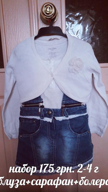 Шикарный набор, джинсовый сарафан-трансформер, можно отстегивать шлейки, получится юбочка, + блуза, можно добавть еще болерошку с красивым цветком, распродажа! Сарафан 100 грн, комплект: реглан+болеро+сарафан-150 грн., сост. новой вещи.