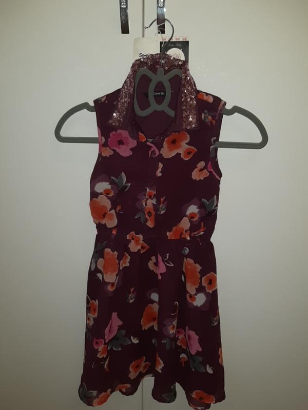 плаття б/у фірма George розмір 5-6 р,110-116 см матерія шифон висота по спинці 65 см ширина під ручками 28 см на талії резинка спереду трішки коротше чим ззаду
