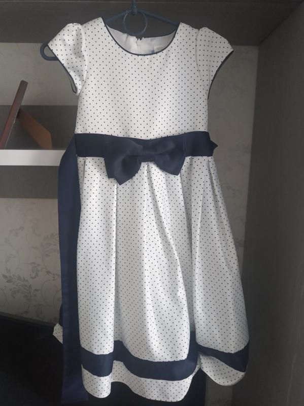 Плаття святкова або на випуск в дитячий садок! Колір біле в темно синій горох. Стан ,як новий . Одягали 2 рази. На худеньку дівчинку.
