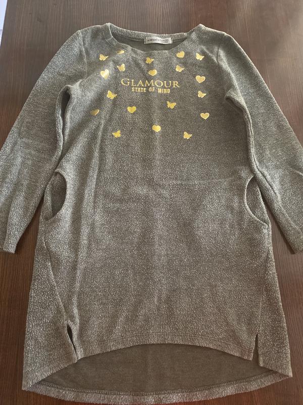 Платье на девочку, сезон весна-осень. Цвет серый. Есть карманы. Сзади чуть длиннее. Параметры: длина спереди 63 см, длина сзади 71 см, ширина в груди 38 см и тянется, в бёдрах 40 см и тянется, рукав 46 см, плечи 31 см