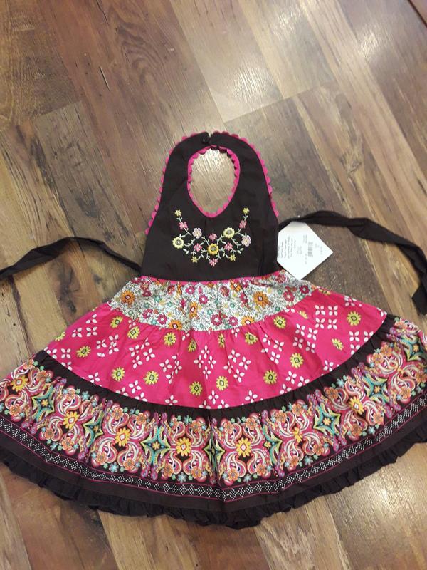 Красивый сарафан,натуральный хлопок.Заказывали в Америке,переросли.Замеры:длина от шеи спереди,грудь 23,за счет резиночки сзади тянется до 30 в полуобхвате.