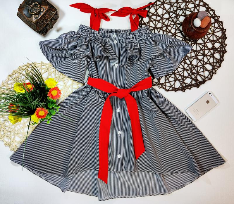 Легкий летний сарафан ткань софт ,украшен рюшей , спереди застегивается на пуговки , поясок в комплекте РЕКОМЕНДУЮ!!!! размер/дл.( по передней планке, без бретелек)/пог 128/54/35-4шт 134/58/38-3шт 140/60/40-4шт 146/62/41-4шт 152/65/41-2шт + - 2см