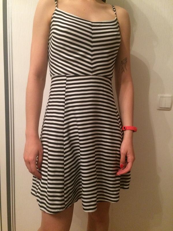 Черно-белый полосатый сарафан на подкладке, легкая приятная ткань. Застегивается на змейку на боку. Никаких дефектов и нюансов.