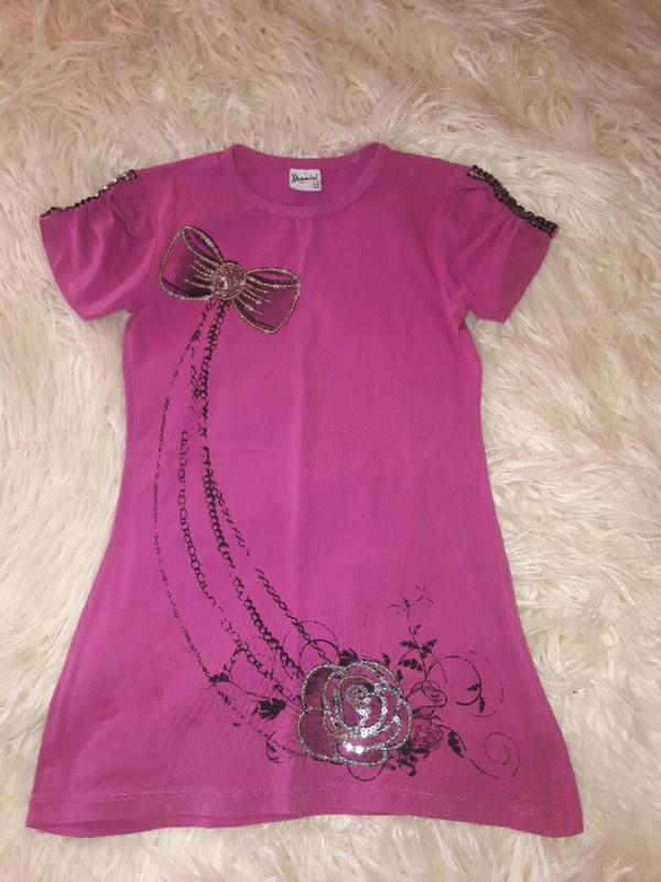 Туніка фіолетова прикрашена аплікацією-малюнком бантик та квітка, на рукавчиках блискучі паєточки, можна одягати на зріст 140-152 см, знизу є маленька дірочка, непомітна, можна пришити схожі паєтки на те місце, за це ціна знижена.