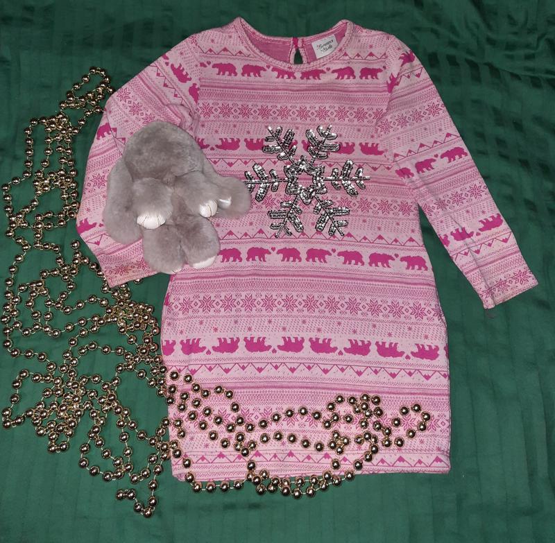 плаття туніка на 104- 110 см., тепле, красива новорічна аплікація сніжинка. На спині застібається на гудзик. По бокам два кармани.