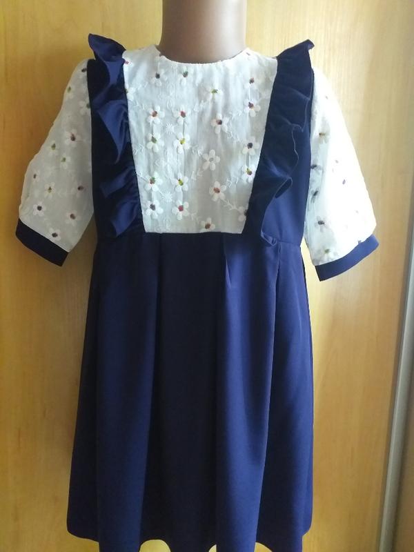 Красиве плаття для дівчинки. Тканина синій штапель + білий батист з вишивкою. Розмір:110(5років) Пог-31см. Довж.виробу-53см.Довж.спіднички-32см. Розмір:116(6років) Пог-32см.Довж.вир.-57см.Довж.спіднички-34см. Розмір:128(8років) Плг-35см.Довж.вир-63см.Довж.спіднички-38см. Розмір: 140(10років) Плг-37см.Довж.вир-69см.Довж.спіднички-43см.
