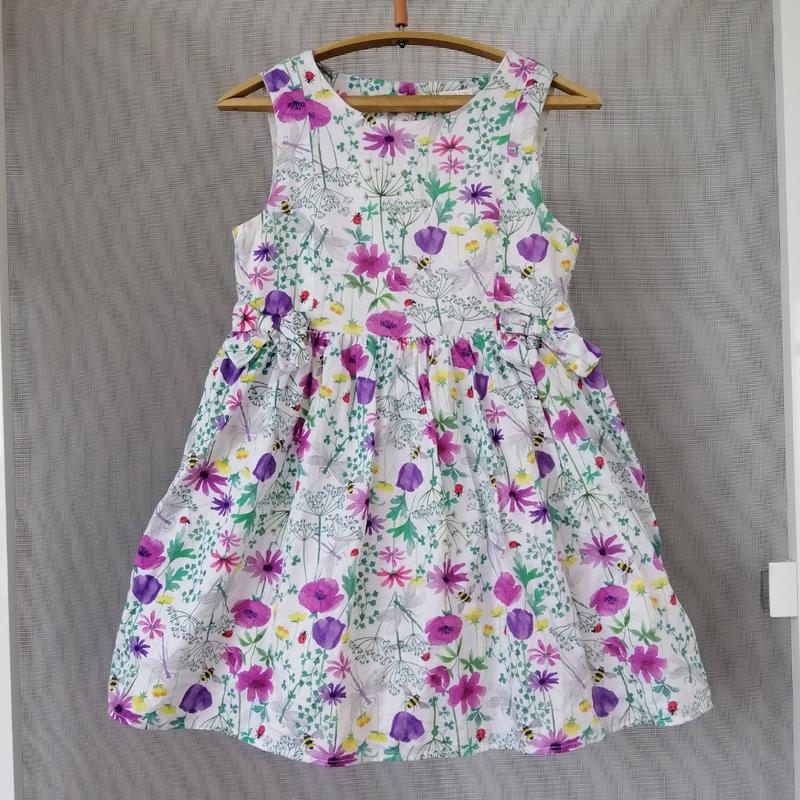 Красивое платье с цветочным принтом из тонкого хлопка. На платье изображены: пчелы, божьи коровки, стрекоза и разные цветы. На подкладке с оборкой из фатина. Застегивается на пуговицы на спине. Очень нарядное. Замеры: ПОГ - 32см ПОТ - 31см Длина - 63см Плечо - 4,5см Ширина низа - 69см Пройма - 18см