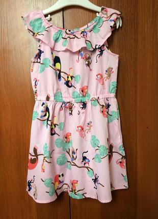 Легеньке, тоненьке плаття від H&M p.98 (2-3 роки). Абсолютно нове, але бірку зрізала. Ніжно рожеве з веселими мавпочками, яскраве і стильне. Резинка на поясі, декоративна рюшка на плечах, ґудзик на спинці. Дуже приємне до тіла, ідеально для спекотного літа.