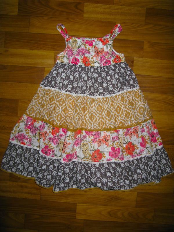 дуже пишний сарафан Matalan на 4-5 років. 97% бавовна, 3% метал. нитка (люрекс). Підкладка-100% бавовна. Довжина від плеча - 66 см, ПОГ-29 /42 см (по грудях на резинці). Стан відмінний