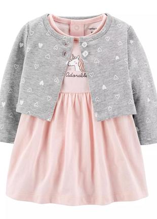 Шикарне плаття з единорожком ніжно рожевого кольору з рюшами на плічках, ззаду на кнопочках. Кофтинка-балеро сірого кольору в сердечка на 2 гудзиках підійде як до цього сукні, так і іншим нарядам. Розмір 12 місяців Тканина 100% бавовна