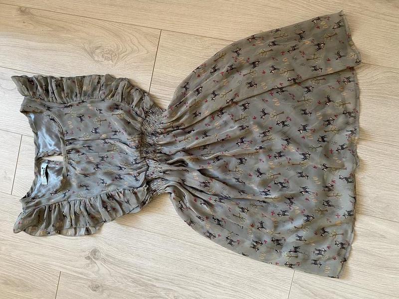 Воздушное платье с принтом природы и олененка бемби. Талия на широкой резинке, сзади застегивается на пуговку. Не прозрачная подкладка Подходит на ростовку 150-158 см Длина: 83 см ПОГ: 45 см