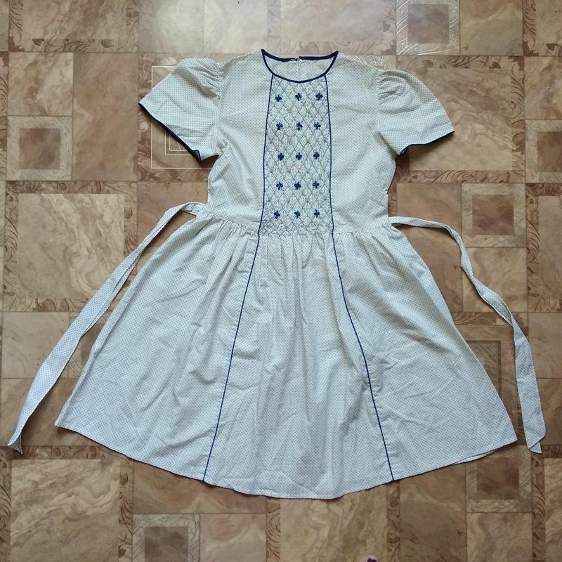 Летнее платье на девочку в горошек в идеальном состоянии Размер 10-11 лет (140-152 р.) Замеры: длина платья 81 см длина юбки от талии до низа 49 см плечи 33 см рукав 18 см (короткий) ПОГ - 39 см ПОТ - 35 см цвет белое в горошек ткань 100% хлопок
