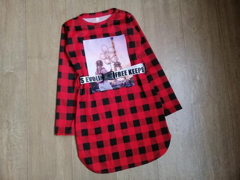 Стильное платье в клетку с боковыми карманами, ткань французский трикотаж. Аппликация пришита. Пояс идет в комплекте. Цвет красный+черный 128 - 1шт 152 - 1шт 158 - 2шт Замеры осуществлялись вручную, с одной ростовки, возможна разбежность в 1-2см. 128 - длина 63, пог 32, рукав 44 152 - длина 72, пог 38, рукав 52 158 - длина 74, пог 40, рукав 53