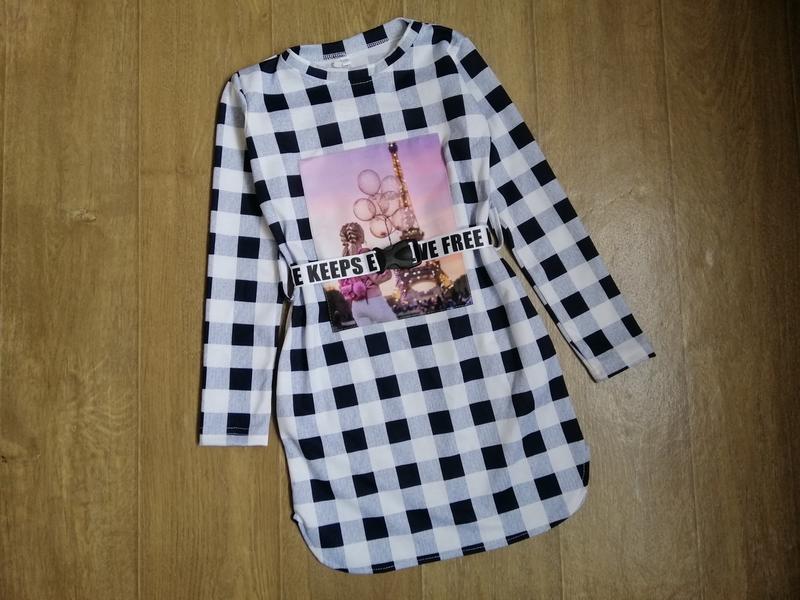 Стильное платье в клетку с боковыми карманами, ткань французский трикотаж. Аппликация пришита. Пояс идет в комплекте. Цвет темно синий+белый 140 152 Замеры осуществлялись вручную, с одной ростовки, возможна разбежность в 1-2см. 140 - длина 67, пог 35, рукав 48 152 - длина 72, пог 38, рукав 52