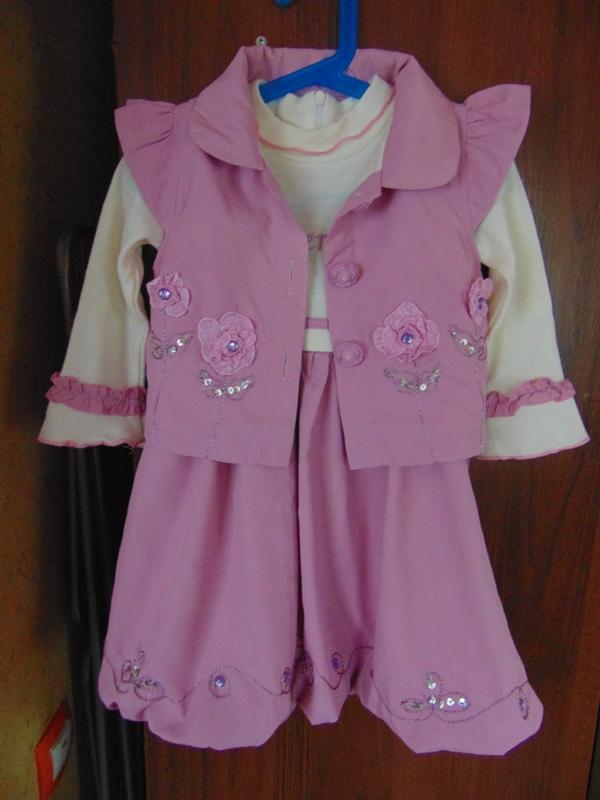 Платье на 3-5 лет на рост 104-110 в хорошем состоянии, талия завышена, пояском фиксируется, есть к нему жилетка, но там есть нюанс, смотрите на последнем фото ( внизу голубоватая полоса) можно носить без жилетки. Длинна-54, ширина-26, плечи-23,5, рукав-30.