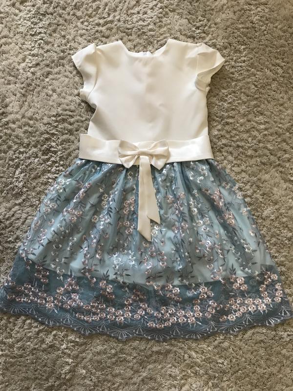Нарядне платтячко, ніжне , вдіте лише 2-а рази , в ресторан, без нюансів,пояс з бантиком , спідничка полу прозора, знизу підкладка стан відмінний. Довжина 71 ПОГ 32 ПОТ 33 Плече 7